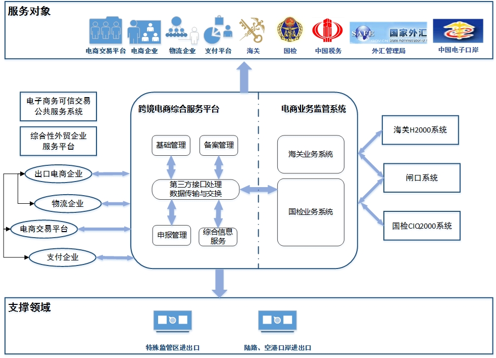 2、實現(xiàn)跨境電商綜合服務平臺與各監(jiān)管單位的信息互聯(lián)互通;