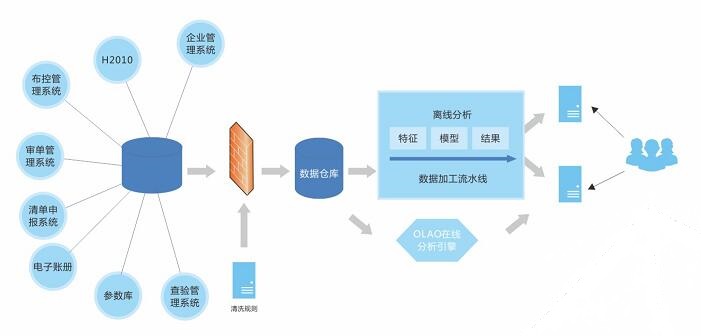 系統(tǒng)整合現(xiàn)有H2010通關(guān)管理系統(tǒng)和各信息系統(tǒng)的數(shù)據(jù),通過添加智能對象特征實現(xiàn)各類數(shù)據(jù)的分類;通過數(shù)據(jù)建模實現(xiàn)分析方法的模塊化、程序化、可視化;利用大數(shù)據(jù)云計算功能實現(xiàn)數(shù)據(jù)的智能分析和加工,按照異動信息、一般貿(mào)易風(fēng)險分析、加工貿(mào)易風(fēng)險分析和主要稅源商品風(fēng)險分析四大門類進(jìn)行結(jié)果展示。